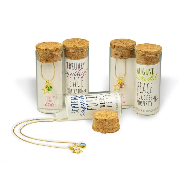 Birthstone necklace with crystal setting, star charm, and gold dipped snake chain in a bottle.